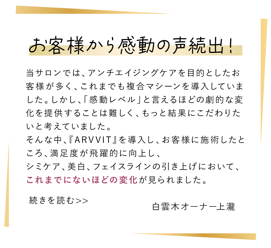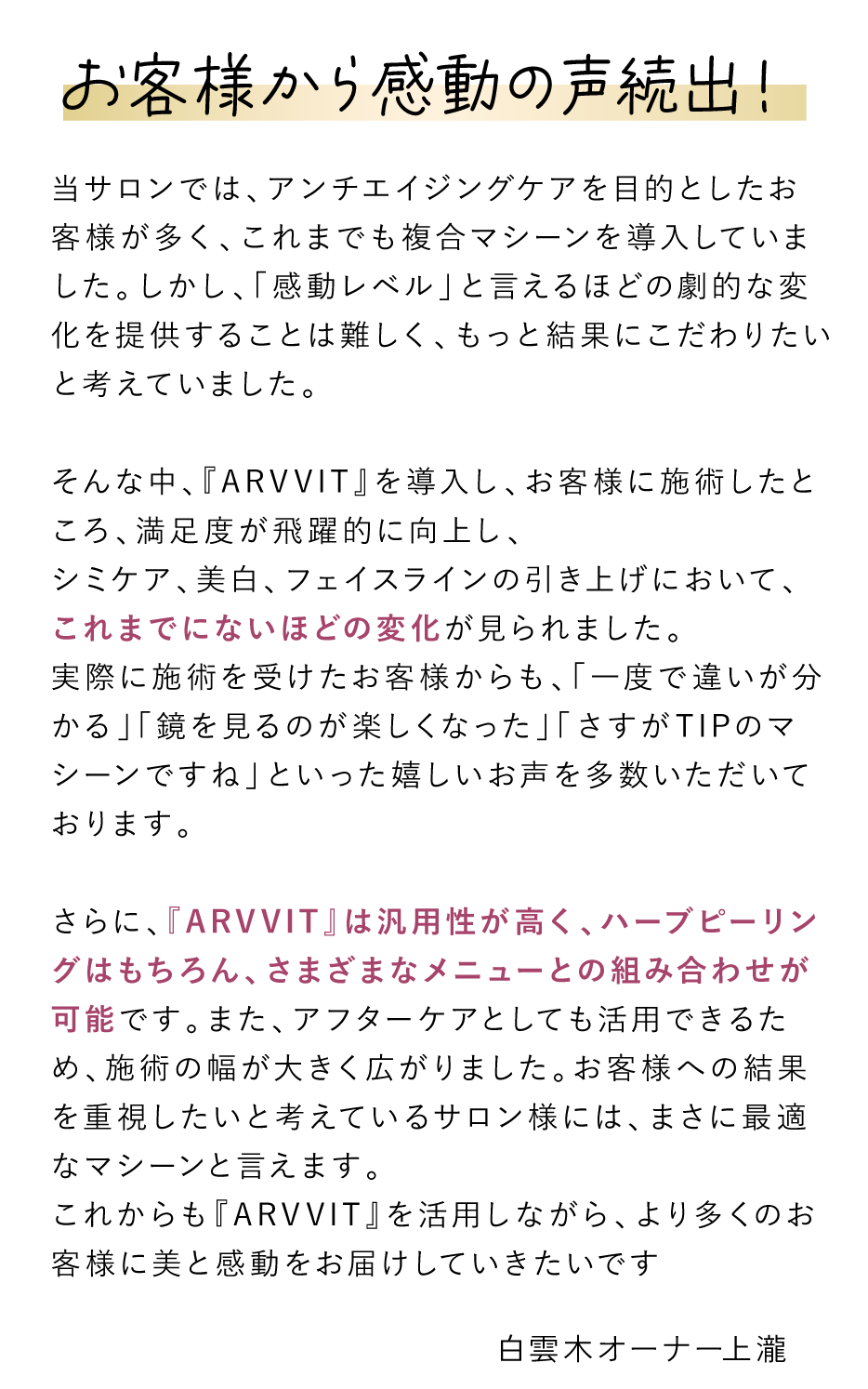 肌トラブルへの効果、安全性を大前提として、美容機器の知識や、シミやニキビの原因に対しての皮膚理論までも習得できるマシン開発が実現しました。あらゆるサロンメニューとの組み合わせや単体メニューで、自信を持ってお客様にご提案していただきたいです。