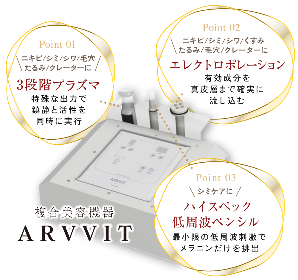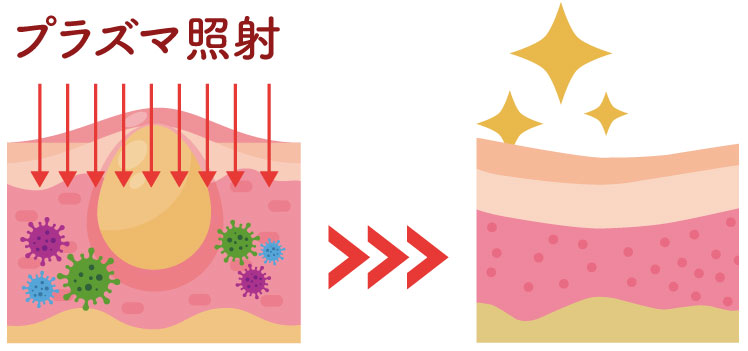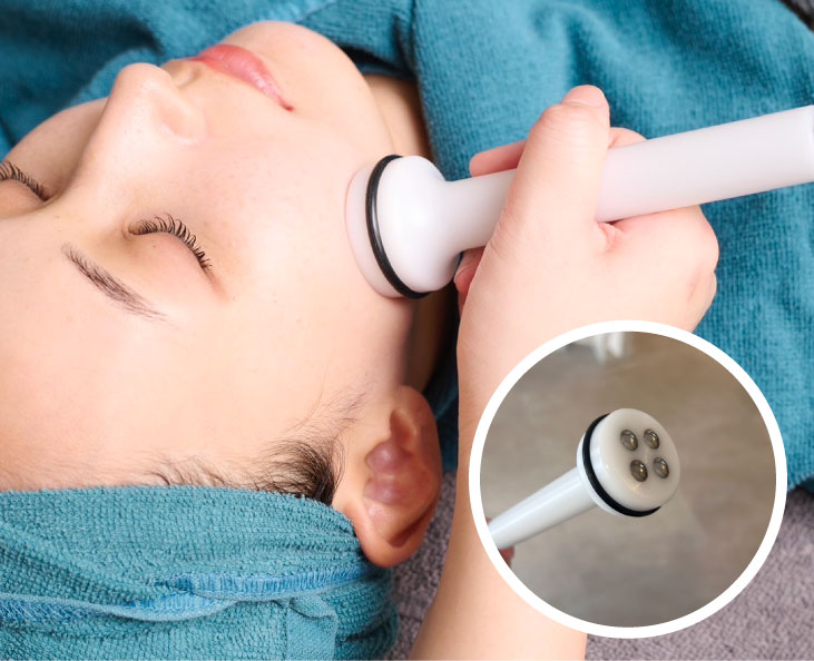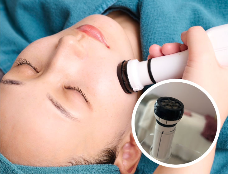 第4の性質をもった物質のプラズマ。滅菌、殺菌効果が高くニキビの炎症を抑える効果があるだけでなく、真皮層に入る活性効果が線維芽細胞を刺激し肌の土台を造ります。ターンオーバーを高めメラニンを排出し、瑞々しい肌に再生する効果があります。