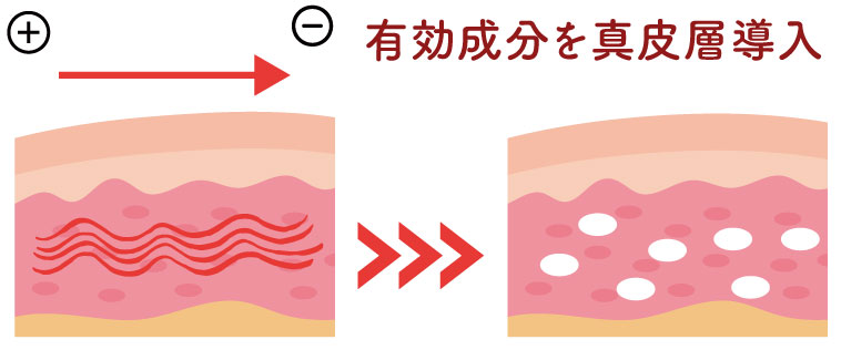 エレクトロポレーション(電気せん孔)により、 一時的に細胞間にスペースを作り、有効成分を皮膚の深部(真皮層)に導入していきます。